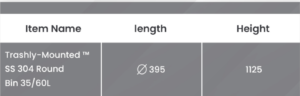 HomeUncategorizedTrashly-Mounted ™ SS 304 Round Bin 35/60L Trashly-Mounted ™ SS 304 Round Bin 35/60L Get a Quote Category: Uncategorized Product ID: 58025 Description Description The TrashlyMounted Round Bin 35/60L is a sleek, space-saving solution for waste disposal. Available in 35 and 60 litres, it mounts on walls or posts, fitting seamlessly into any setting with its durable, modern design. Related products Trashly-Mounted ™ SS 304 Wall-Mount Ashtray Get a QuoteRead more Trashly-Essentials™ SS 304 Heavy-Duty round Bin with Ashtray Get a QuoteRead more Trashly-Mounted™ SS 304 ProMesh Wall Bin Get a QuoteRead more